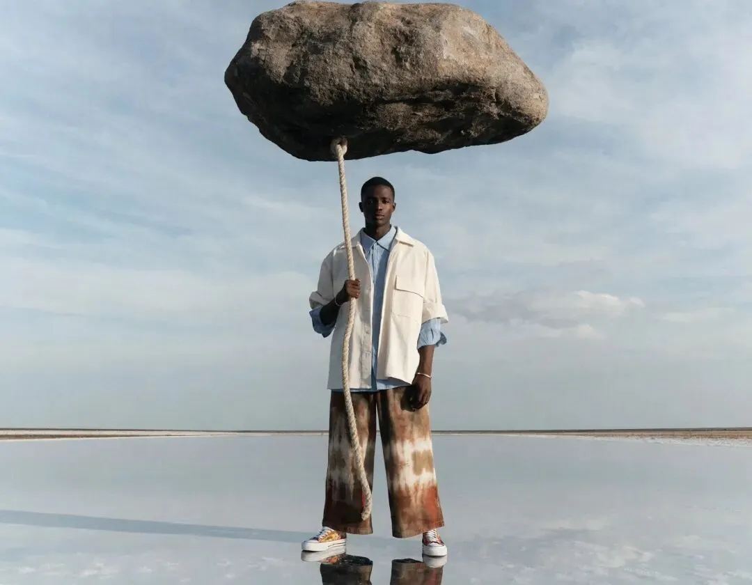 ❝A man in a relaxed modern outfit standing large in frame, holding a long rope that is attached to a massive floating stone above him. The stone hovers calmly in the sky, perfectly balanced. The environment is minimal: flat ground, distant horizon, soft sky. No extra objects. Strong vertical composition, realistic face, natural lighting, surreal but grounded, high-end editorial style.