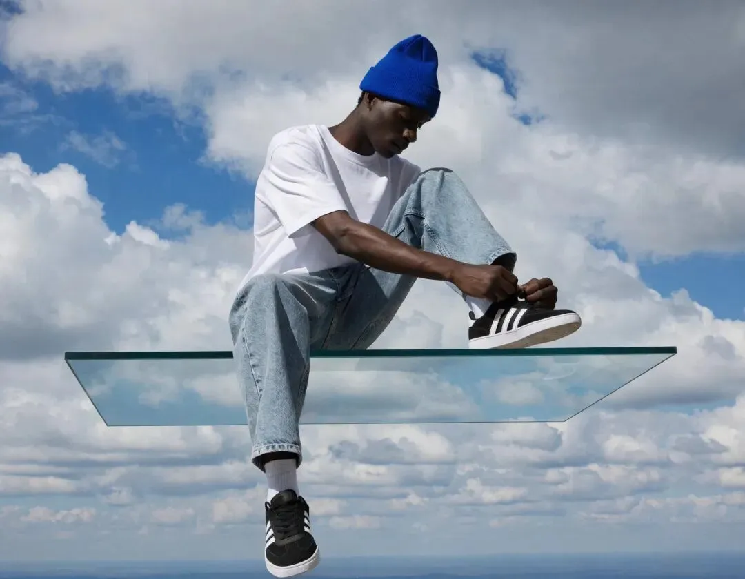 ❝A man sitting on a large suspended rectangular platform floating slightly above the ground, his figure large and central. He is tying his shoe calmly. The platform is clean and minimal with no extra objects. Open sky, distant horizon, soft shadows, no reflections. Strong sense of isolation and balance, realistic face, cinematic editorial mood.