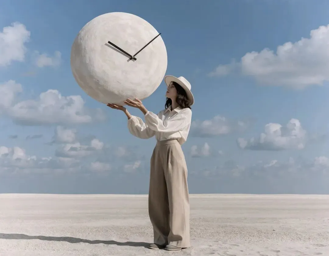 ❝A large-scale scene of a woman in a soft tailored outfit standing prominently in the foreground, gently holding a giant floating clock tilted in the air in front of her. The clock is simple and minimal, with clean hands and no numbers. The ground is flat and open, with a clear horizon and soft clouds. The character dominates the frame, calm expression, natural posture. Soft daylight, no reflections, no clutter, cinematic editorial photography, ultra clean composition.