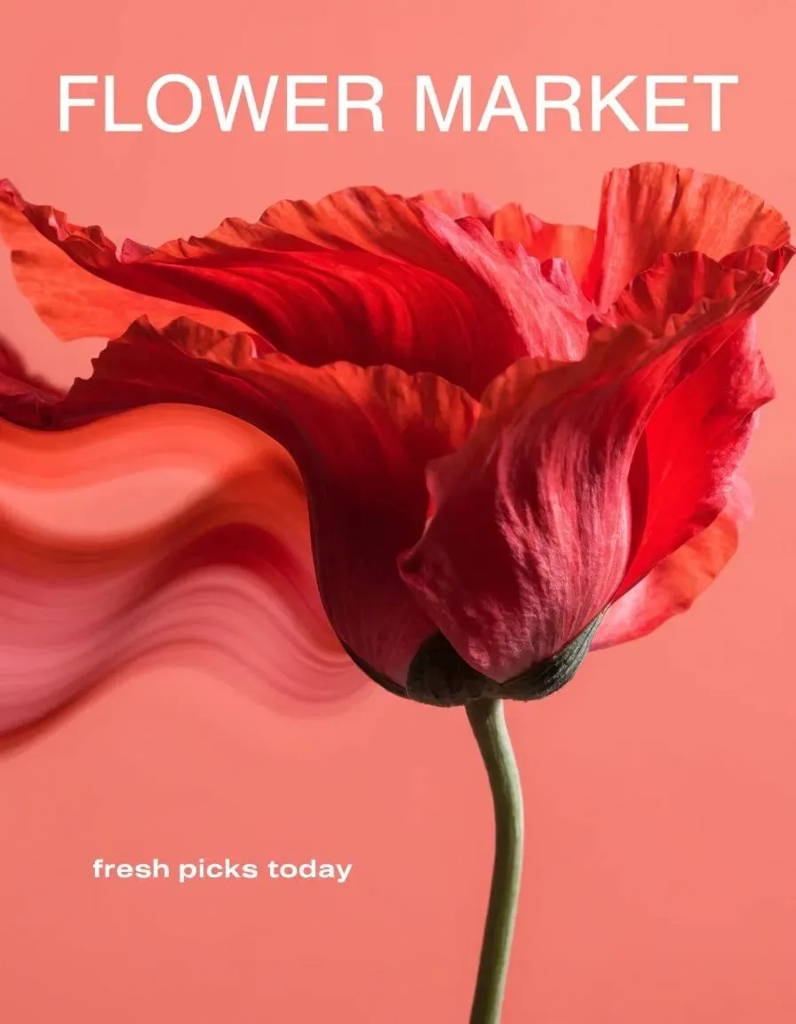 ❝Realistic red poppy flower, petals stretched into soft flowing motion trails to the left, silky blur effect, rich saturated red tones, smooth matte coral background — large bold text 'FLOWER MARKET' centered top, smaller text 'fresh picks today' bottom left.