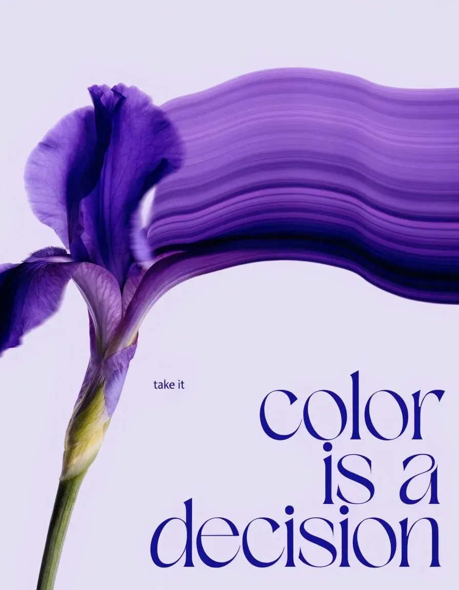 ❝Deep violet iris, delicate petals flowing into uniform horizontal motion trails, smooth and glossy, flat lavender background — large asymmetric text 'color is a decision' aligned right, small text 'take it' near stem.