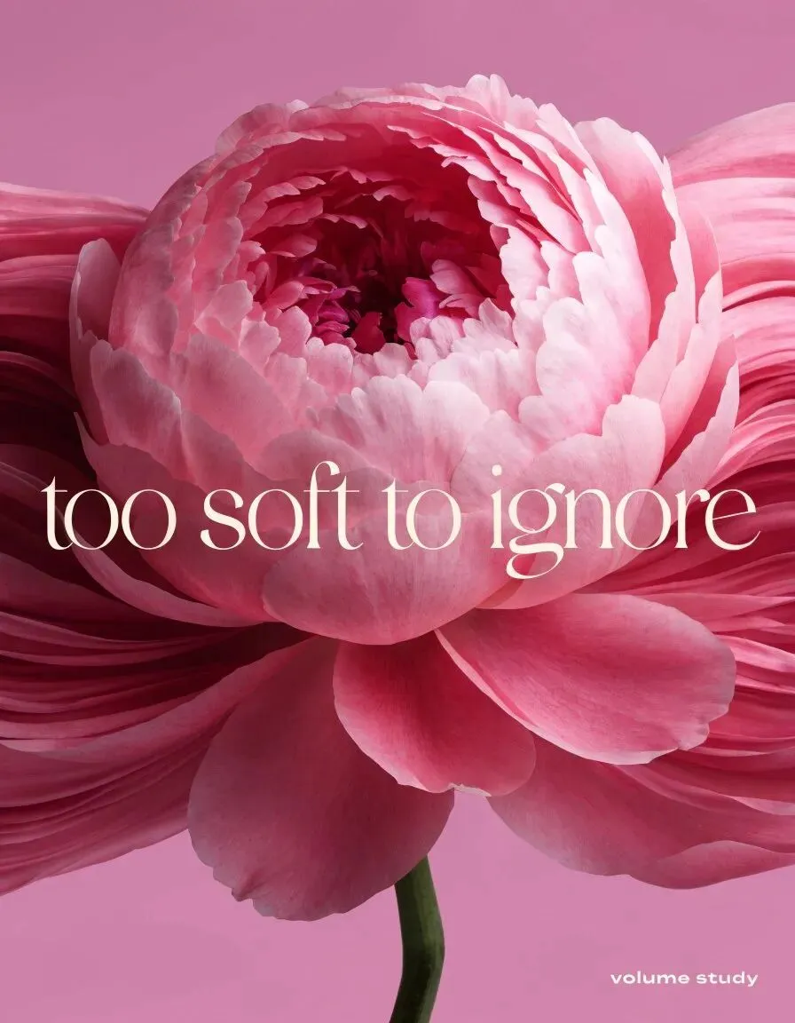 ❝Full pink peony, layered petals melting into identical horizontal streak flow, lush and dense, flat dusty pink background — large text broken into lines 'too soft to ignore' centered, small text 'volume study' bottom right.