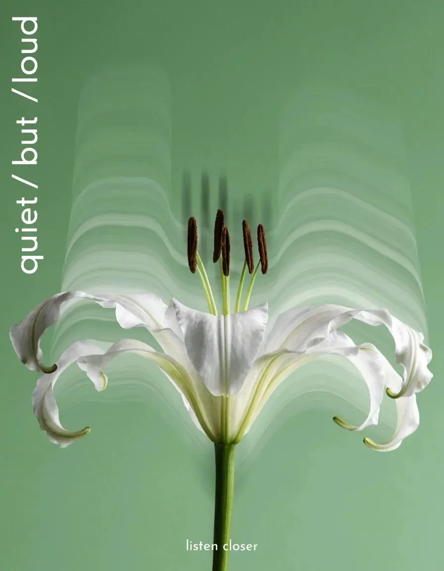 ❝White lily, elongated petals dissolving into smooth horizontal motion ribbons, same blur intensity, flat sage green background — tall narrow text 'quiet / but / loud' aligned vertically left, small text 'listen closer' bottom.