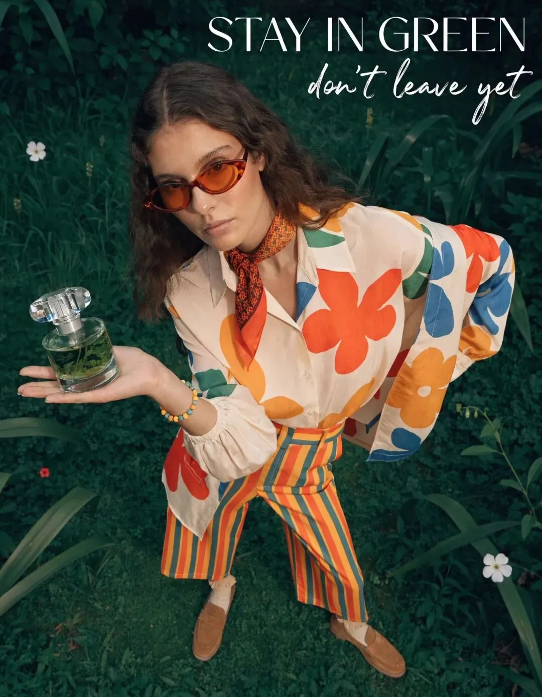❝Photorealistic advertising banner, female model standing slightly bent forward as if moving, surrounded by a clean deep green field with minimal flowers, holding perfume in an extended hand. Text: 'STAY IN GREEN'. Handwritten: 'don’t leave yet'.