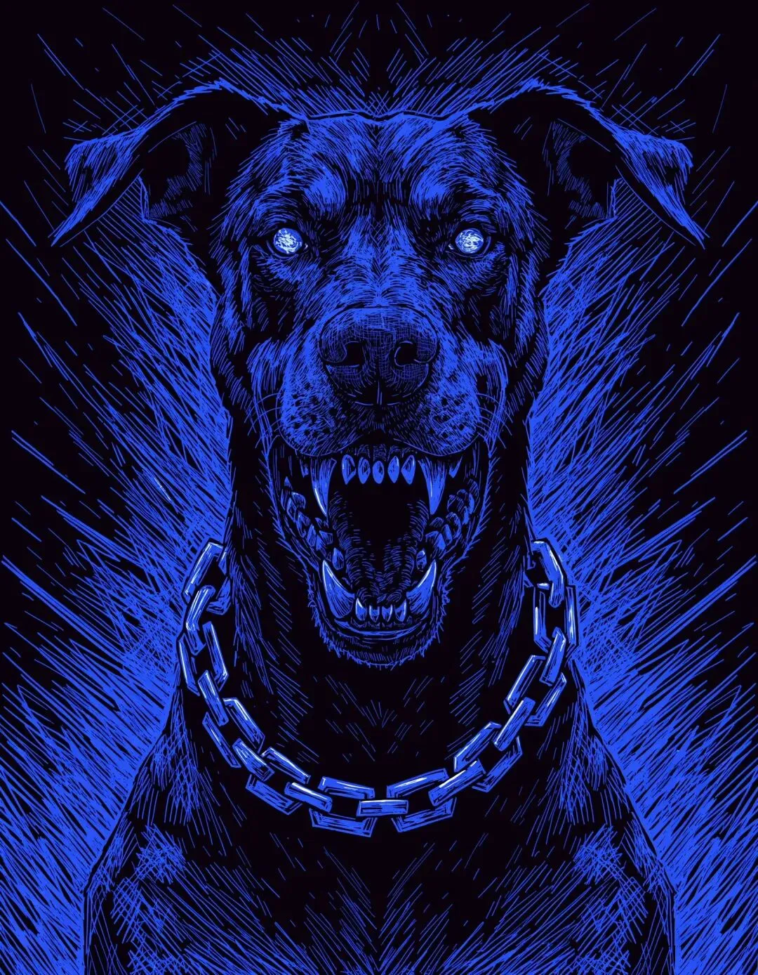 ❝Create a bold, high-contrast graphic illustration of a Doberman dog facing forward with its mouth open, showing sharp teeth in a powerful, intense expression. The entire image is rendered in a deep electric blue and black color palette. The dog’s form is highly detailed with engraved-style linework, emphasizing muscle structure, fur texture, and facial features. The eyes glow subtly, adding a striking focal point. The dog wears a heavy chain collar with sharp, metallic details. The background is dark with a textured, grainy pattern and radiating energy-like lines behind the head, enhancing the dramatic, poster-like composition. The overall style is graphic, aggressive, and stylized — similar to a screen print or etched illustration, with strong contrast and a limited color palette.