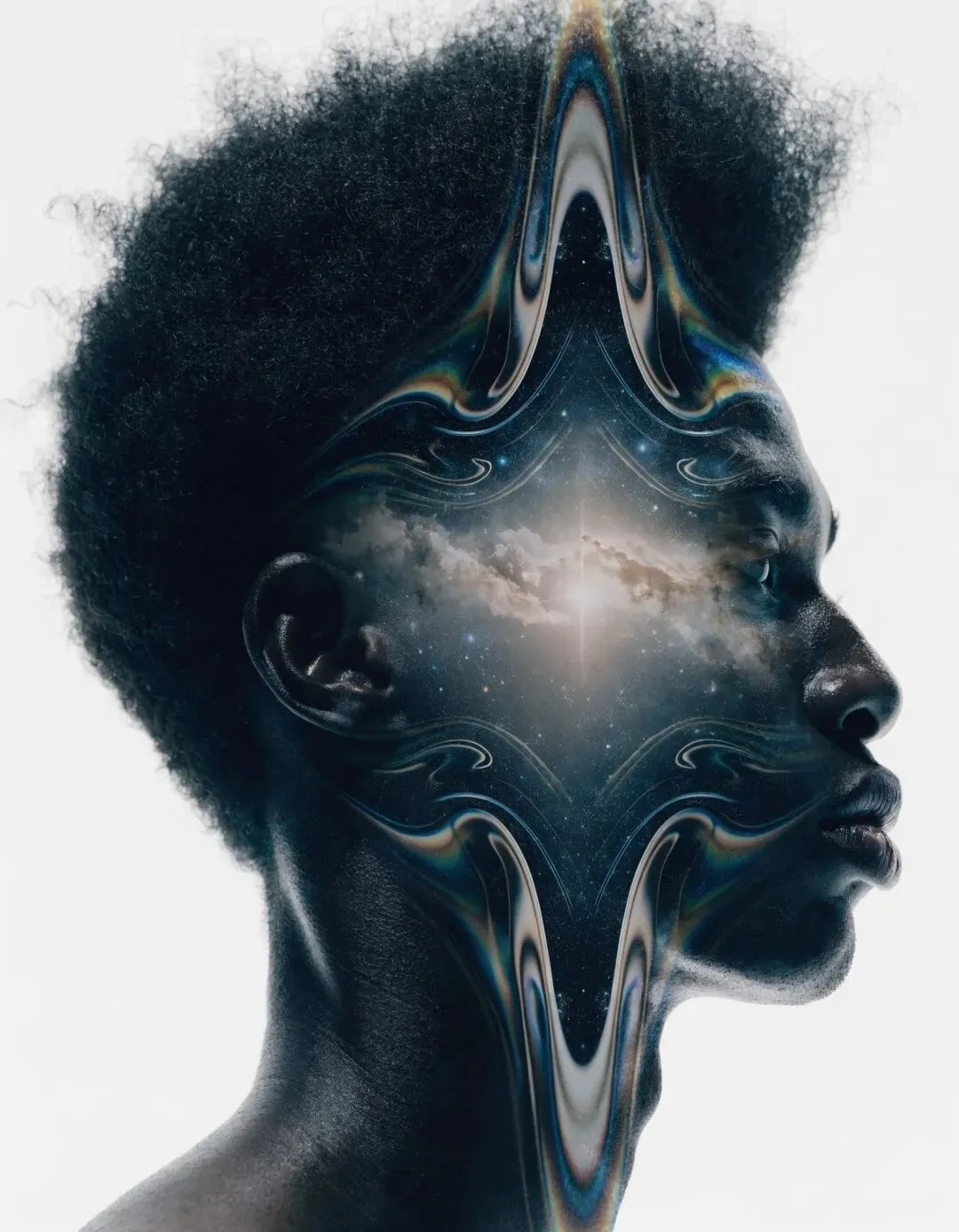 这条 prompt 用的是:editorial、rippled iridescent、double exposure、35 mm film、sharp facial features、symmetrical。它本质上仍然是在搭视觉骨架,而不是在堆“炫词”。这种写法,换模型也成立。