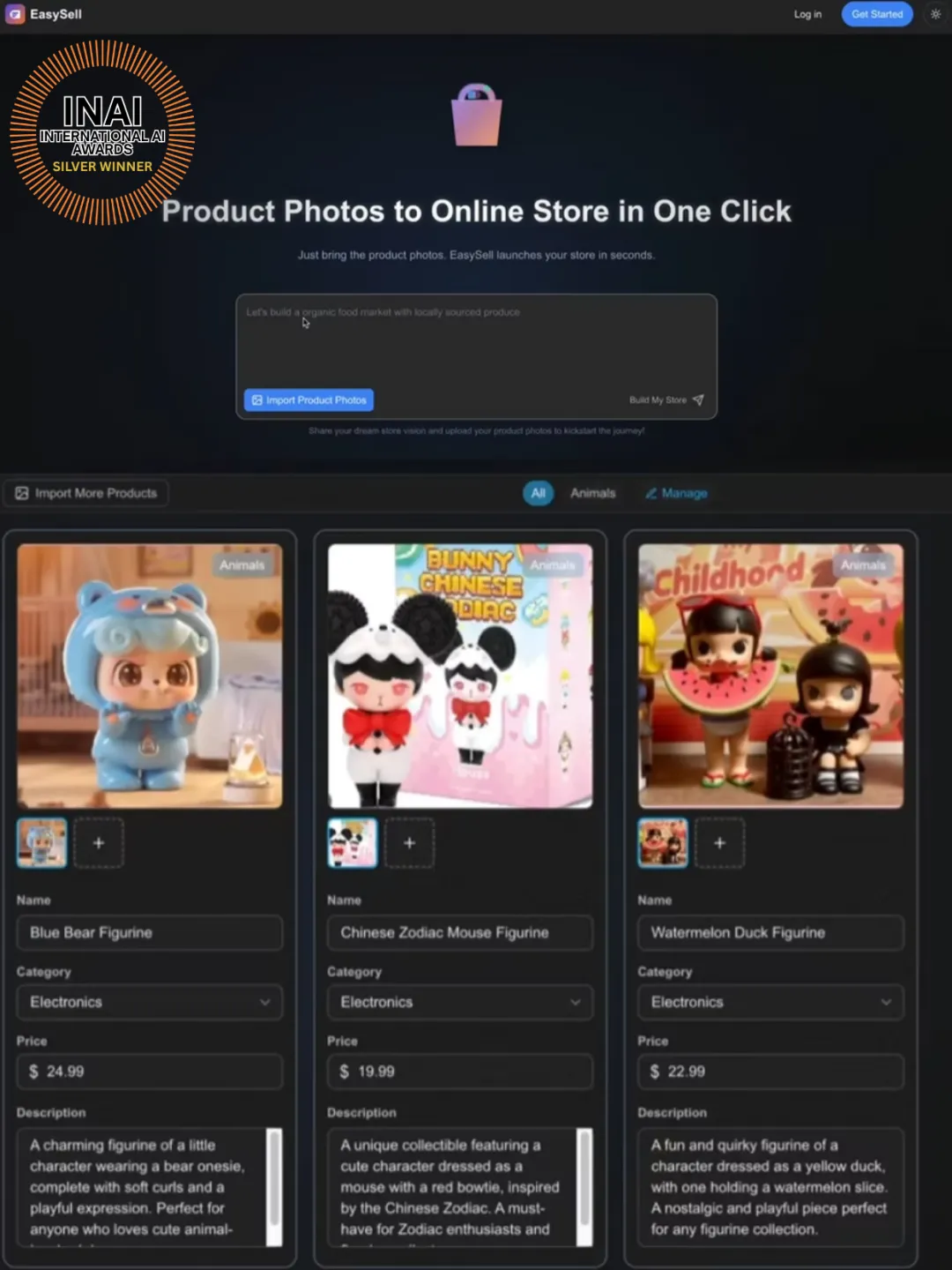 国际AI大奖(International AI Awards 2026)里,有一个拿到最佳AI应用银奖的项目,叫 EasySell,是来自美国的设计师 Renju Liu 做的一个AI平台。