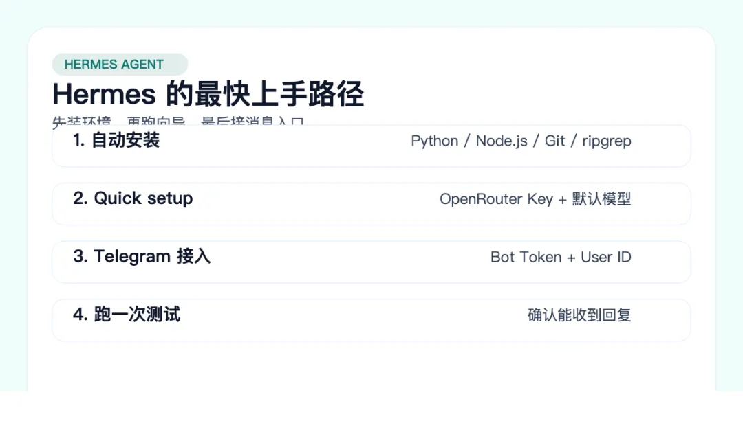 Hermes,领取《Hermes Agent 安装检查清单》和《本文图解 Slide Deck(PDF)》。很多人一看到新的 Agent 项目,就会先被概念吸走注意力:学习循环、多模型、消息集成、跨平台协作,听起来都很厉害。