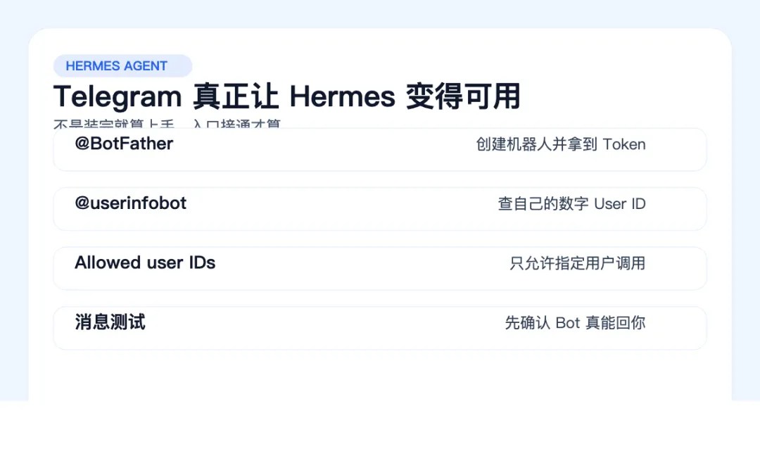 Hermes 真正从“装好了”跨到“能用了”,关键在于你有没有把它接进一个真实入口里。对大多数人来说,TG 就是那条最实用的入口。
