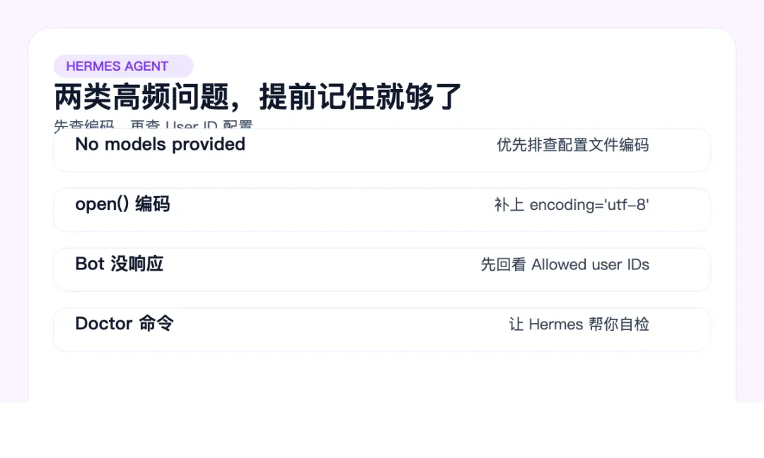 hermes、hermes setup、hermes gateway、hermes doctor 这几个用顺,已经能覆盖大多数场景。八、最常见的两个坑,提前记住会省很多时间