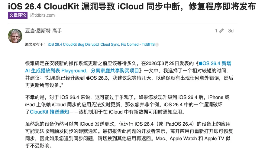 3月底发布的 iOS 26.4 正式版,带来了一个不大不小的毛病:iCloud 同步异常。