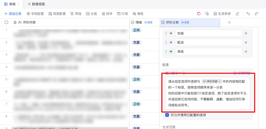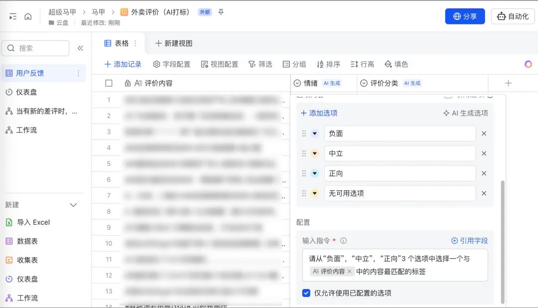 AI落地千店连锁:五个真实场景和一个人才判断从无到有搭建千店连锁餐饮会员体系,干了一年多,AI我每天在用,不是拿来写PPT汇报的那种"用",是真的在干活。以前几万条外卖评价靠人工看,或者用关键词抓,问题是顾客不按套路写:"可真太牛了,足足等了四十分钟,我是真的谢了",关键词抓不出问题,但这是个差评。现在我们把评价同步进飞书多维表格,用自带的AI语义分析模板稍作调整,自动拆情绪,识别差评到底是口味、食安还是配送,中文里那种"明褒实贬"的高级黑也能识别。以前处理这些要三四个小时,现在十几分钟。飞书有免费额度,额度不够单独买,基础版一年不到一万块,比市面上动辄几十万的语义分析系统划算太多。
