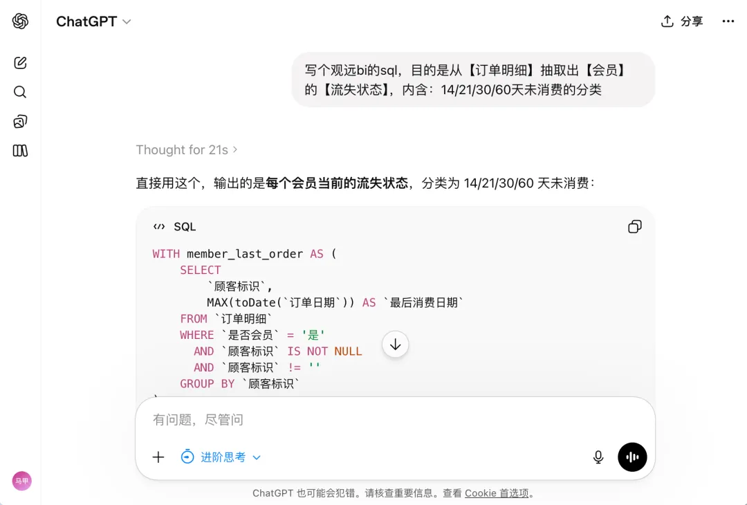 以前业务想看数据,得写需求给技术,技术排期、写代码、出报表,一来一回最快也要几天,现在我用AI写SQL,逻辑缜密,代码精干。不是谁被淘汰了,是中间那层翻译被压缩了,不过会用AI的数据分析同学,产出比纯运营背景的质量高得多,跟会写代码的产品经理和技术协作时天然有优势一个道理。