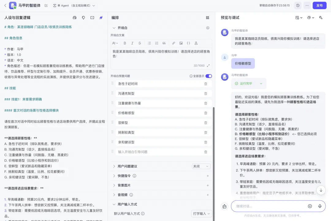 加盟商培训是个老大难,你出了标准话术,门店不一定照做;你派人下店检查,成本扛不住,我在探索的方式是:把培训内容做成知识库,让AI扮演顾客,模拟到店的完整路径跟门店做问答。比如AI说"我不喝咖啡,有无咖的新品推荐吗?",门店用标准话术回答,系统实时评分,答对不扣分,答错扣分,80分以上算达标,像小时候玩的网页文字游戏,但这次考的是真实业务。