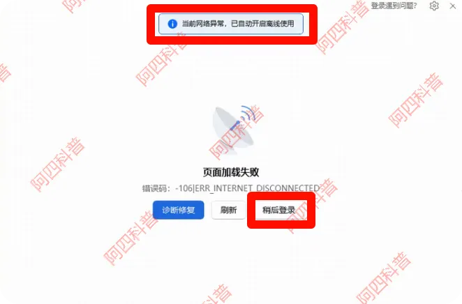第二个方法,断网强制离线法。先把电脑断网,拔网线或者禁用网卡都可以。然后打开WPS文档,点立即登录,这时候会显示网络异常,自动开启离线使用;如果没弹出,点稍后登录,关闭登录页面,就能正常编辑了,编辑完再重新联网。