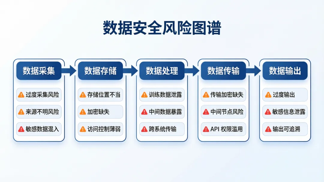AI 应用涉及数据的全生命周期:采集、存储、处理、传输、输出。每个环节都可能成为攻击目标。