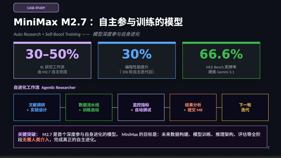 结果令人印象深刻:30-50% 的 RL 研究工作流由 M2.7 自主完成;经过 100 轮自主迭代后,编程性能提升 30%;MLE Bench 奖牌率达到 66.6%,媲美 Gemini 3.1。