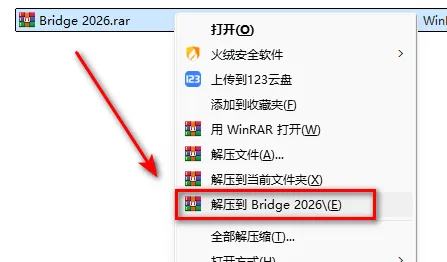 1.鼠标右键解压到“Bridge 2026”,解压之前必须关闭杀毒软件,不然破解文件解压后文件夹显示为空。
