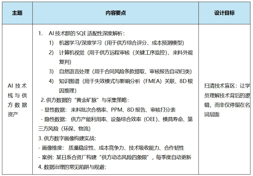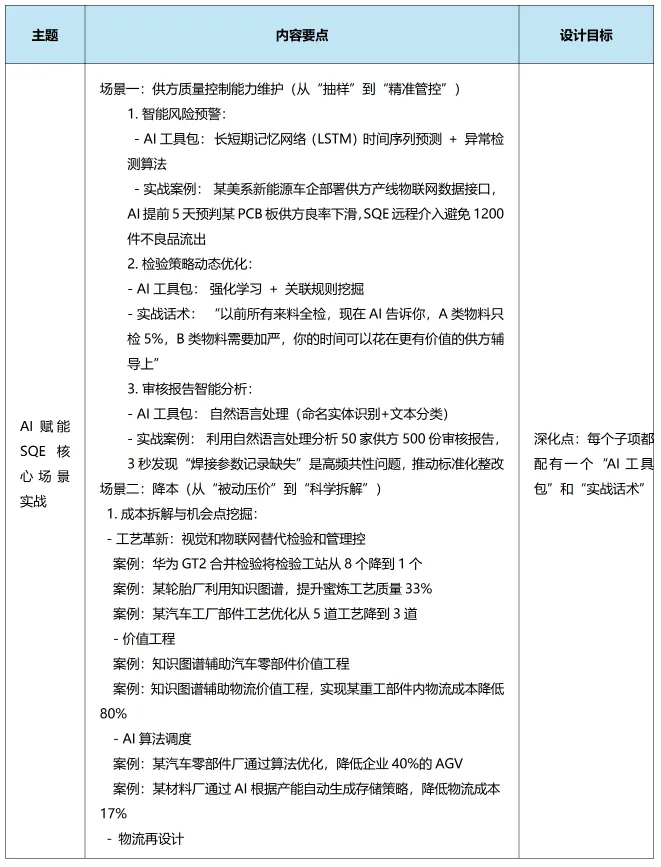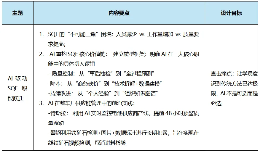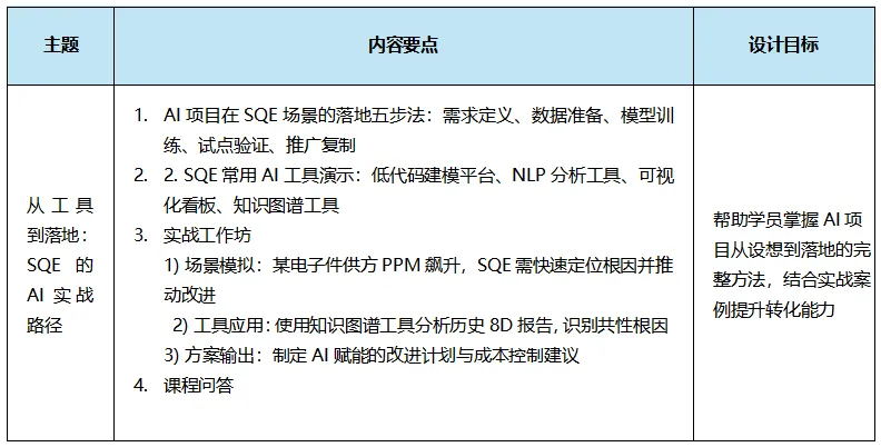 在汽车行业价格战与供应链波动加剧的背景下,SQE团队普遍面临“人减量增”的困境。传统的“出差救火+经验判断”模式已难以为继。本课程旨在深度赋能SQE,掌握利用AI将隐性成本显性化、质量风险前置化、改进经验结构化的能力,实现从“被动响应”向“主动智控”的跨越。授课对象:
