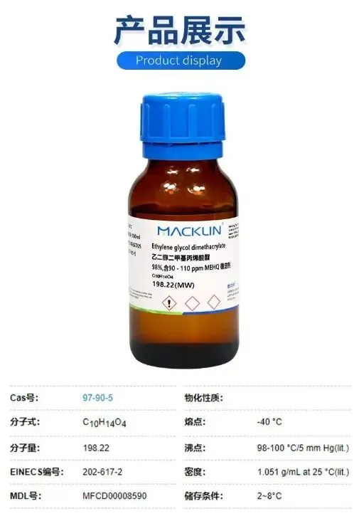 乙二醇二甲基丙烯酸酯(Ethylene glycol dimethacrylate)CAS号:97-90-5分子式:C₁₀H₁₄O₄分子量:198.22纯度:98%规格:100ml品牌:麦克林 Macklin储存:2~8°C 冷藏