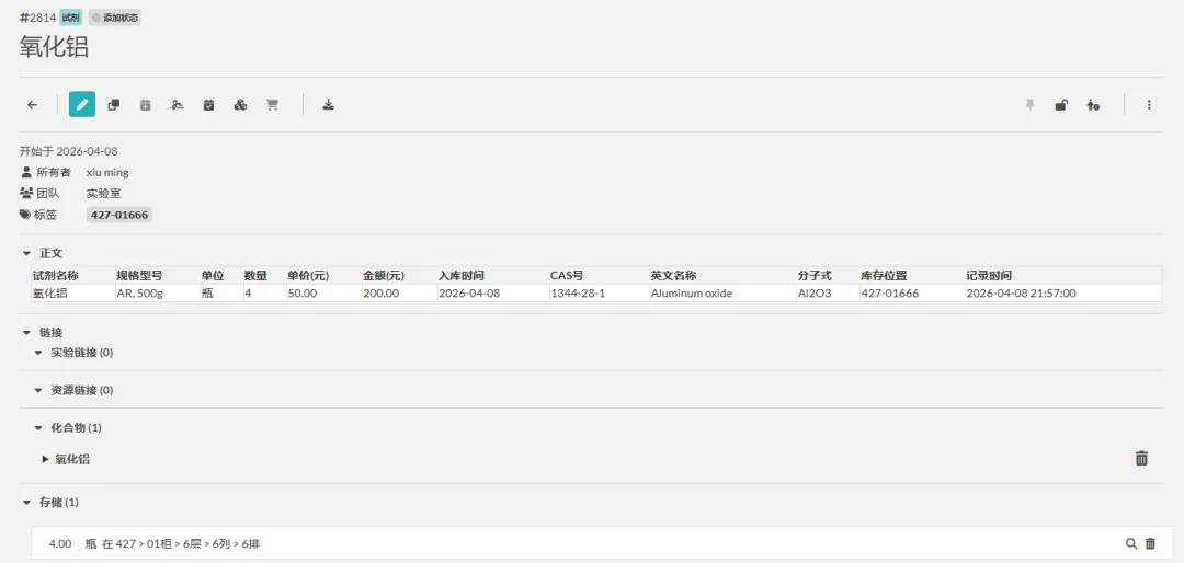 存储路径:427 > 01柜 > 6层 > 6列 > 6排 ✅容器 ID:966 数量:4.00 瓶Item 2814(氧化铝)已正确关联到位置 427-01666。