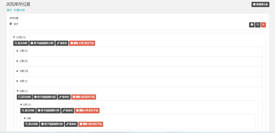code 04-08 22:10:13存储路径显示错误:427 > 01柜 > 2层 > 4列 > 1排 > 6层 > 6列 > 6排 应该是 427 > 01柜 > 6层 > 6列 > 6排。存储单元层级创建时关联错了父节点。