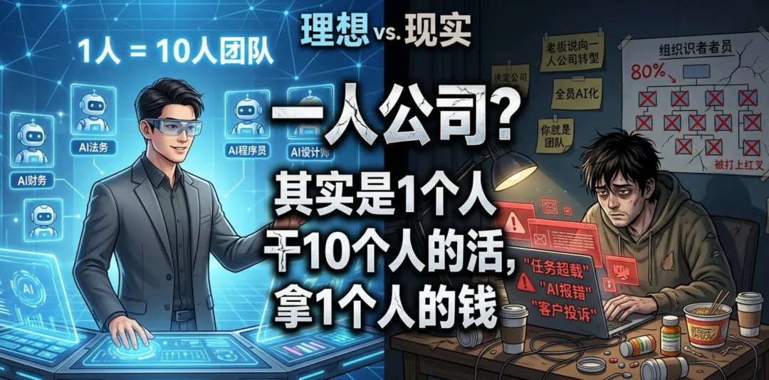 所谓的“向一人公司发展”,很多时候只是企业大规模缩减开支的遮羞布。它给了老板一个心理暗示:我裁掉这80%的人,剩下的20%只要学会用 AI,公司就能照常转。但事实证明,剩下的那20%往往会因为巨大的压力和单一的职能,迅速陷入职业倦怠。