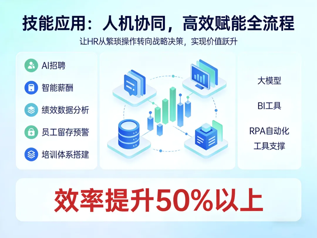 核心技能覆盖AI招聘、智能薪酬、绩效数据分析、员工留存预警、培训体系搭建。熟练运用大模型、BI工具与RPA自动化,可将简历筛选、入转调离、算薪等事务效率提升50%以上,让HR从繁琐操作转向战略决策,实现价值跃升。