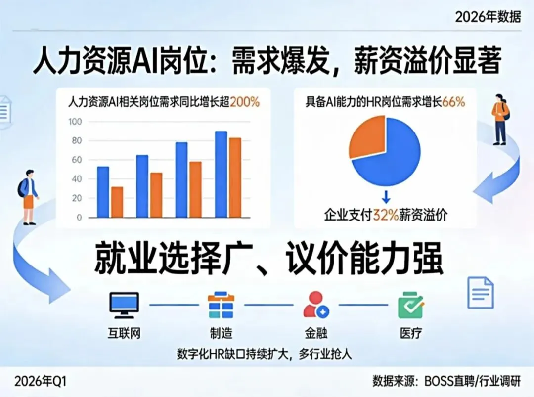 BOSS直聘2026年数据显示,人力资源AI相关岗位需求同比增长超200%;行业调研显示,具备AI能力的HR岗位需求增长66%,企业支付32%薪资溢价。数字化HR缺口持续扩大,互联网、制造、金融、医疗等行业抢人,就业选择广、议价能力强。