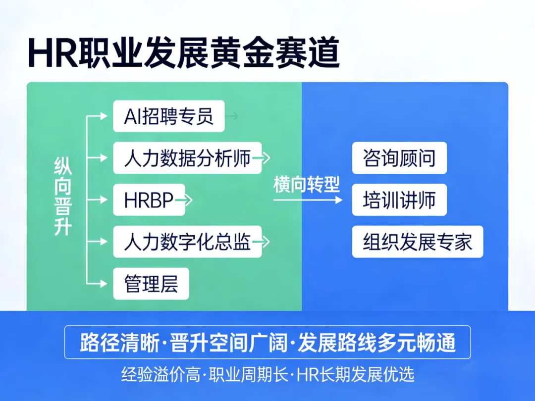发展路线多元畅通:从AI招聘专员、人力数据分析师,进阶为HRBP、人力数字化总监;也可转型咨询顾问、培训讲师、组织发展专家。纵向晋升管理层,横向深耕垂直领域,经验溢价高、职业周期长,是HR长期发展的黄金赛道。