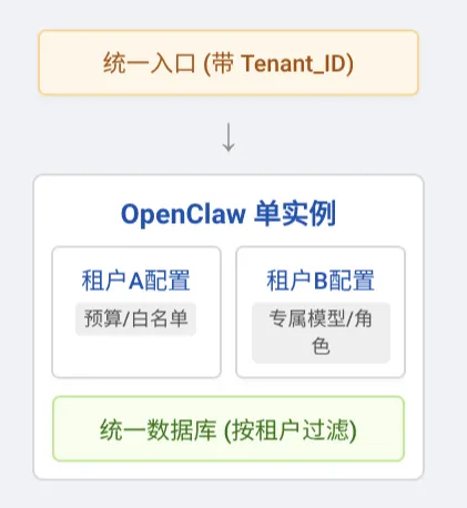 这是目前公认比较正统的企业级方案:一套 OpenClaw 实例,内部做多租户/多部门隔离。 对外是一个统一平台,对内划定多 tenant、多空间的逻辑边界。