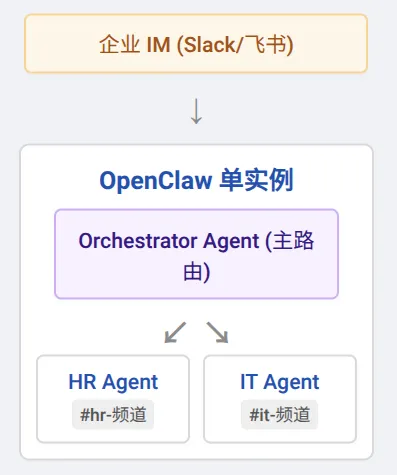 另一个非常流行的轻量级思路是:不从进程/实例层面硬拆,而是把部门抽象成多个专职的 Agent。在同一个 OpenClaw 实例中,配合多 Agent 团队与路由机制来服务不同部门。