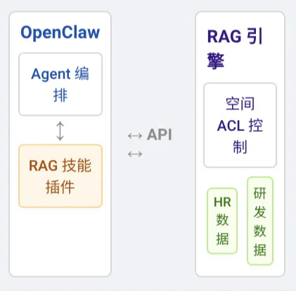 面对复杂的内部文档,很多企业不再用 OpenClaw 硬扛,而是接入专门的企业级 RAG 引擎。由 RAG 引擎负责文档解析、分库和多空间权限,OpenClaw 退居幕后,专注智能体编排和动作执行。