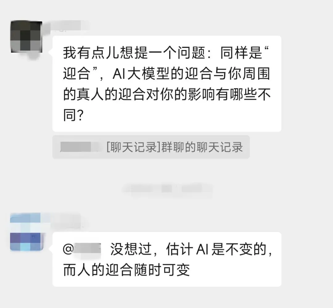 M专家说:“我有点儿想提一个问题:同样是“迎合”,AI大模型的迎合与你周围的真人的迎合对你的影响有哪些不同?”