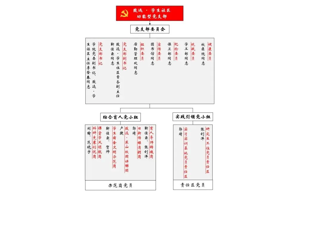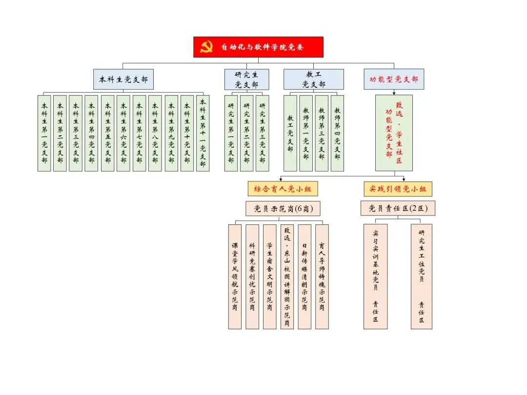 建设致远•学生社区功能型党支部,是自动化与软件学院党委贯彻落实习近平新时代中国特色社会主义思想、推进学生社区党建工作的重要举措。党支部采用校院共建模式,联合学工部(研工部)、保卫部、后勤管理处、校医院、图书馆等部门,从组织上凝聚起多方育人合力。党支部下设综合育人、实践引领2个功能型党小组,打造课堂学风领航、科研竞赛创优、学生宿舍文明、东山校园讲解团、日新传媒清朗、育人导师铸魂6个党员示范岗,以及研究生工位、实习实训基地2个党员责任区,以“6岗2区”模式亮身份、践承诺、办实事。党支部委员会委员分别由各共建单位的党员干部代表担任。