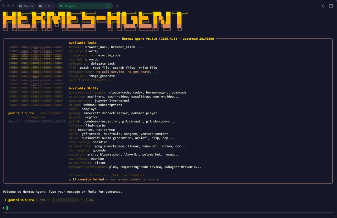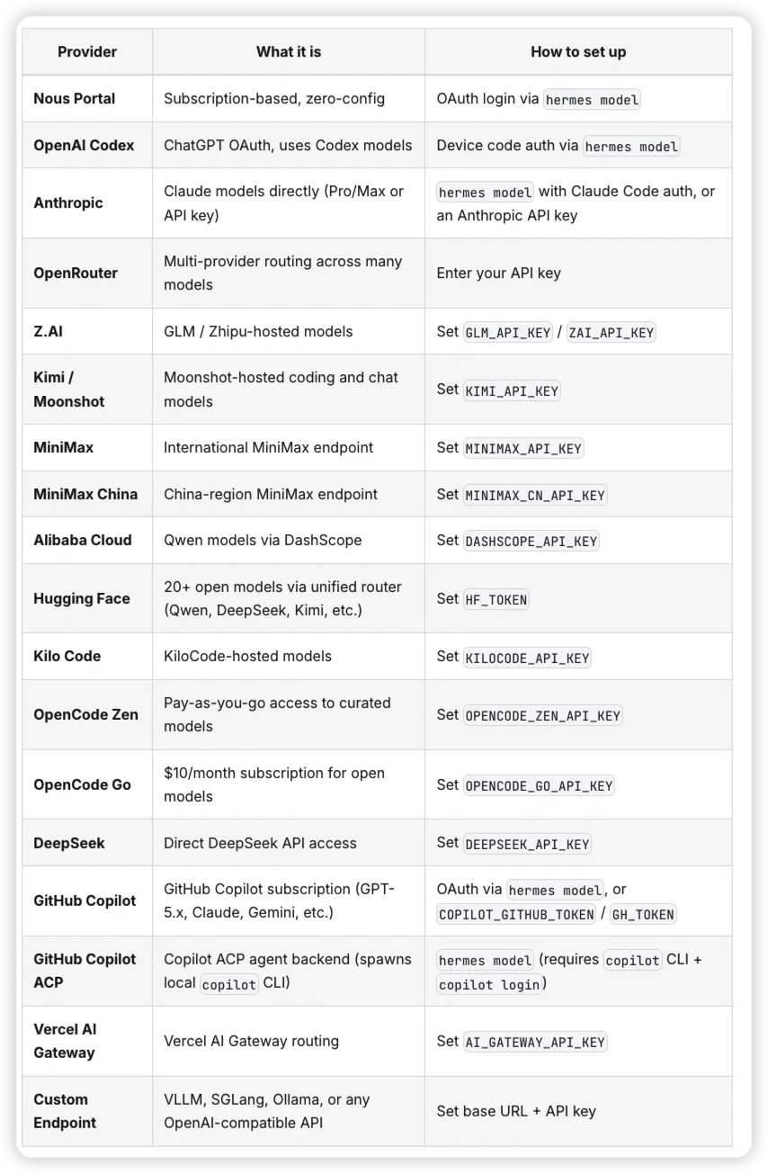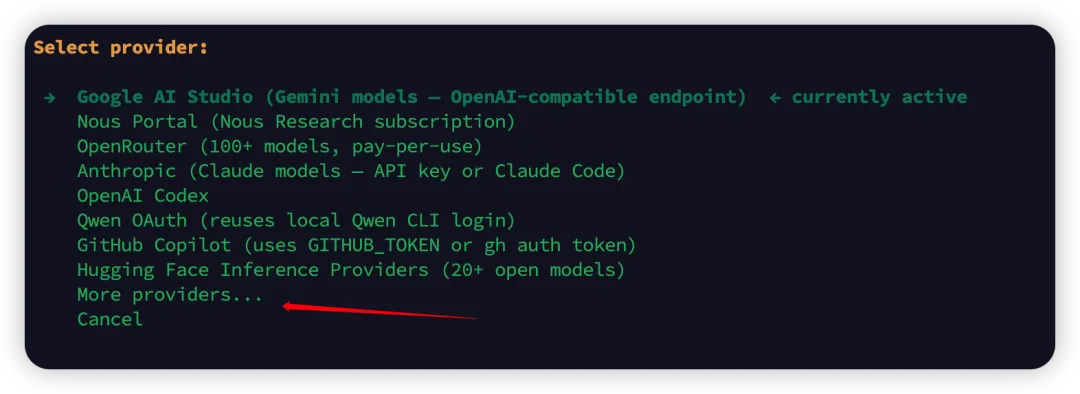 hermes model # Choose your LLM provider and modelhermes tools # Configure which tools are enabledhermes setup # Or configure everything at once比如 hermes model 会引导你选择模型