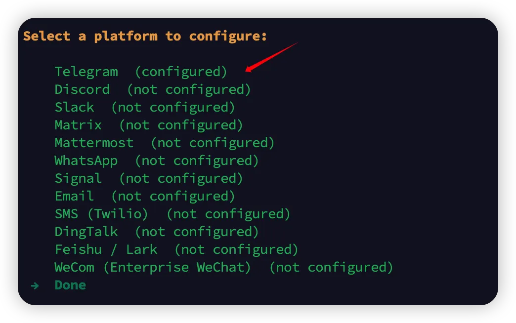 回到命令行,输入: hermes gateway setup
