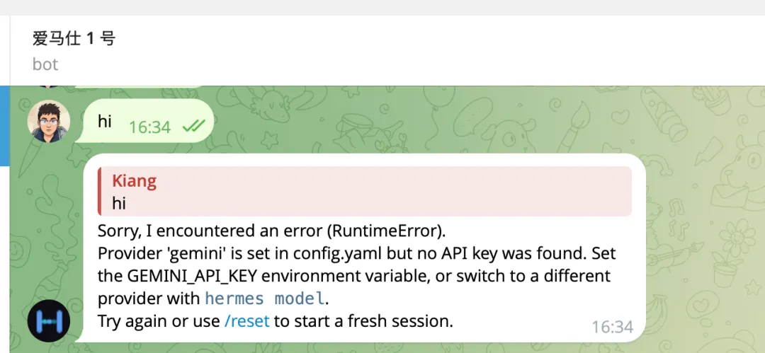 hermes 在 console 里能跑,是因为你的 shell 环境里有 GEMINI_API_KEY 这个变量(比如写在 ~/.bashrc 或 ~/.zshrc 里),但 gateway 进程启动时没有继承这个环境变量。