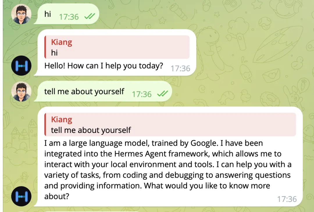 Hermes Agent 与 Telegram 深度集成,配置好了,就可以在任意设备上与 Hermes 智能体对话、发送语音备忘录并自动转录为文字、接收定时任务的执行结果,还可以在群聊中使用该智能体。Telegram 集成是基于 python-telegram-bot 构建,支持文本、语音、图片及文件附件。