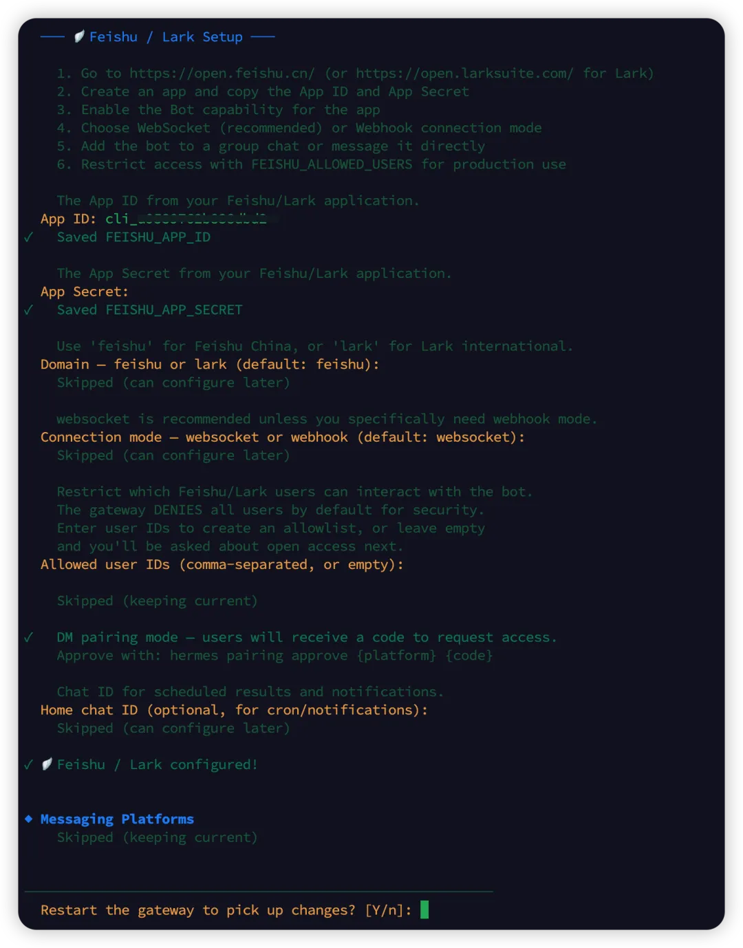跟着引导输入前面两步获取到的 Token 和 ID, 然后 hermes 会自动帮我们配置