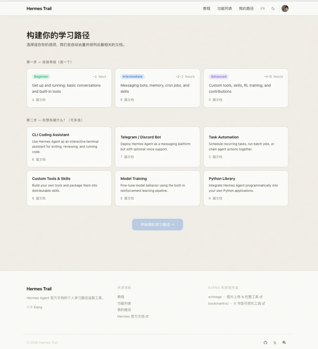 对了,前面也提到了,我为了方便自己学习记录,顺便建了一个学习路径网站 HermesTrail:hermes.kiang.website。