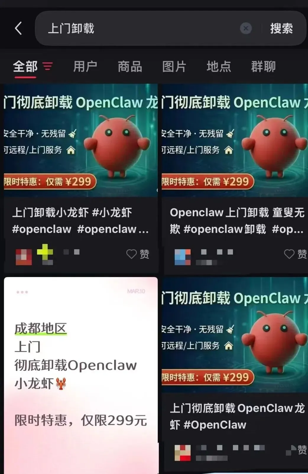 记者在二手交易平台上查询发现,当天已有不少 “上门卸载 OpenClaw” 的服务上架,部分服务详情标注 “专业远程 / 上门卸载,安全清理、无残留”;还有帖子表示,上门卸载可解决 AI 焦虑,一次上门就能彻底卸载,守护人类自身......