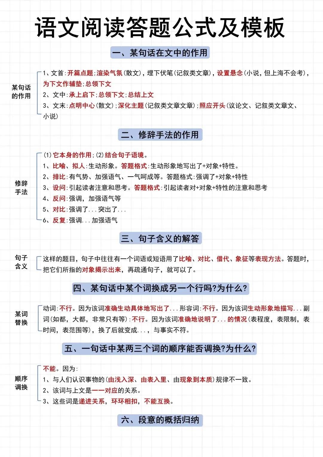 语文阅读理解一直是高中考试的重难点,很多时候同学们读懂了文章,却答不到得分点上,要么漏点,要么表达不规范。其实阅读理解是有答题公式和模板的,掌握这些模板,结合文本分析,就能轻松拿分!