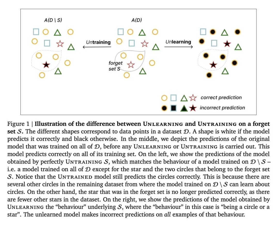指出“机器遗忘(Machine Unlearning)”这一术语被严重滥用,它实际上混淆了两个在数学表达和实际应用上截然不同的问题:“取消训练(Untraining)”和“遗忘(Unlearning)”。 将 取消训练 (Untraining) 定义为逆转特定“遗忘集 ”的经验风险最小化过程。其理想结果等同于仅在剩余数据集()上从头开始训练的模型。 将 遗忘 (Unlearning) 定义为抹除遗忘集 背后所代表的整个底层概念、行为或数据分布。其理想结果是一个“从未见过该概念任何实例”的模型()。 反直觉的观点: 一个完美执行了“取消训练”的模型,可能依然能完美预测它被要求“遗忘”的那些数据。如果遗忘集数据的交叉影响较低,模型完全可以通过剩余数据中学到的泛化知识来做出正确预测。因此,“取消训练”不等于“无法预测”。 揭示了评估指标错位的风险:成员推理攻击(MIA)适用于评估取消训练(如隐私合规),但完全不适用于评估遗忘(如消除危险知识)。因为即使 MIA 查不出某个危险样本在训练集中,模型可能依然掌握着该危险概念。 对过往文献进行了重新分类:删除用户隐私数据或《哈利波特》的一字不差的原文属于 Untraining;而擦除后门、消除有害行为或特定艺术风格则属于 Unlearning。 强调将 Untraining 算法强行用于 Unlearning 任务(例如仅发现部分污染数据时)会导致灾难性失败,因为 Untraining 算法缺乏抹除整个概念所需的“遗忘泛化能力”。 提出了全新的研究方向:正如模型训练需要归纳偏置来实现向“学习”的泛化一样,真正有效的遗忘算法也需要特定的归纳偏置,以便从少量的样本中泛化出对“整个概念的遗忘”。