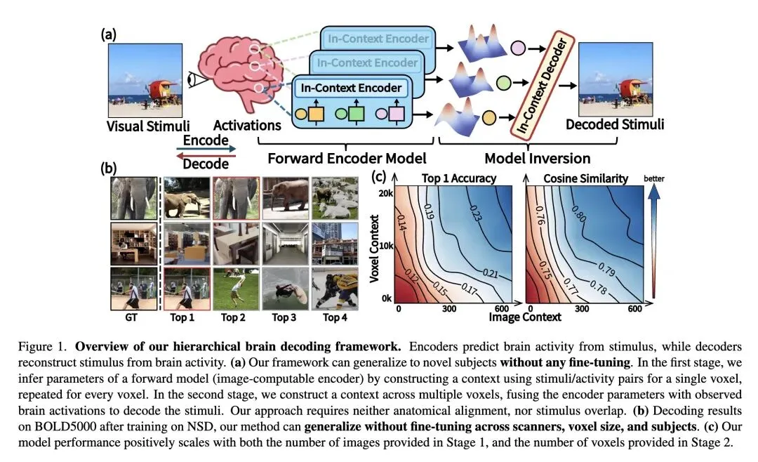 零样本跨主体检索精度:在未见过的受试者上,Top-1 和 Top-5 图像检索准确率大幅提升(如 BrainCoDec Top-1 可达 25.5%,而使用解剖对齐的 MindEye2 仅为 4.11%)。 数据与计算效率:新受试者只需提供约 200 张图像的上下文校准数据,且无需进行耗时的反向传播和梯度更新,极大地降低了应用门槛。 领域泛化能力:突破了单一数据集的限制,模型在完全未见过的 BOLD5000 数据集上同样展现了卓越的精度(平均排序达到 3.49-4.47)。