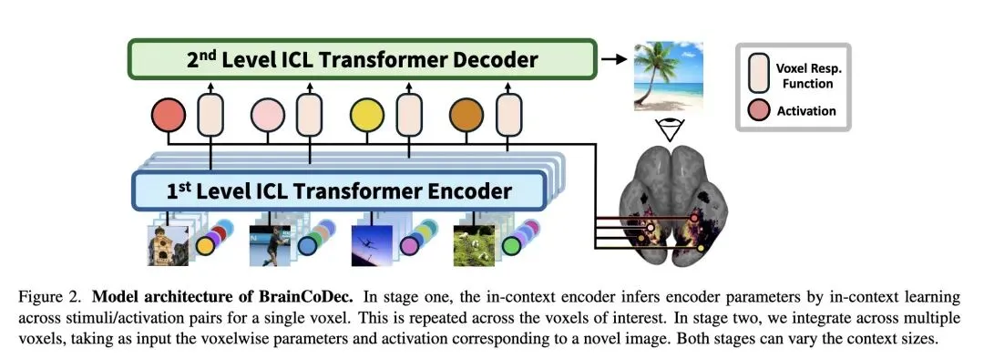 解剖学与功能学的彻底解耦:不再依赖将不同大脑配准到同一个三维物理空间,而是将每个体素视为一个独立的函数,通过“函数逆向(Functional Inversion)”来实现跨大脑的映射。 层次化上下文学习架构:创造性地将 ICL 分为两级。第一级跨刺激学习单个体素的响应规律(求导编码器);第二级跨体素整合信息逆推视觉刺激(解码器)。 无序且可变长度的体素处理机制:由于不同个体的大脑体素数量不同,模型摒弃了传统 Transformer 的位置编码,并引入 logit 缩放,使得模型能够像处理无序集合一样处理数量任意的大脑体素。