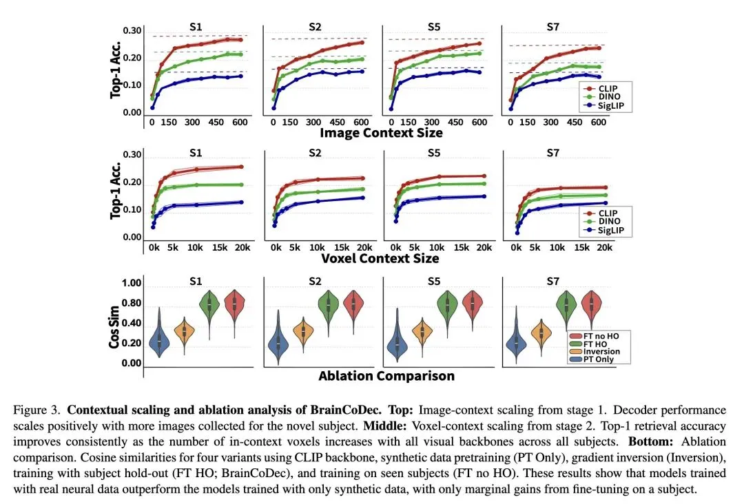 并非绝对的“零样本”:虽然是免训练(Training-free),但在推理时依然需要新受试者提供少量的(如 200 个)“图像-脑激活”对作为上下文提示(Prompt),在完全没有任何先验数据的极端情况下无法工作。 侧重于检索和表征:论文主要评估了图像特征嵌入(CLIP、DINO 等)的解码与检索能力,对于最终像素级图像的生成重建效果,需依赖外接的生成模型(如 Stable Diffusion),未对端到端生成进行深度评估。 极限精度的妥协:尽管在免训练设定下表现惊艳,但实验(图3)也承认,经过受试者专门微调(FT no HO)的模型在性能上限上依然略高于纯免训练的 In-Context 预测。