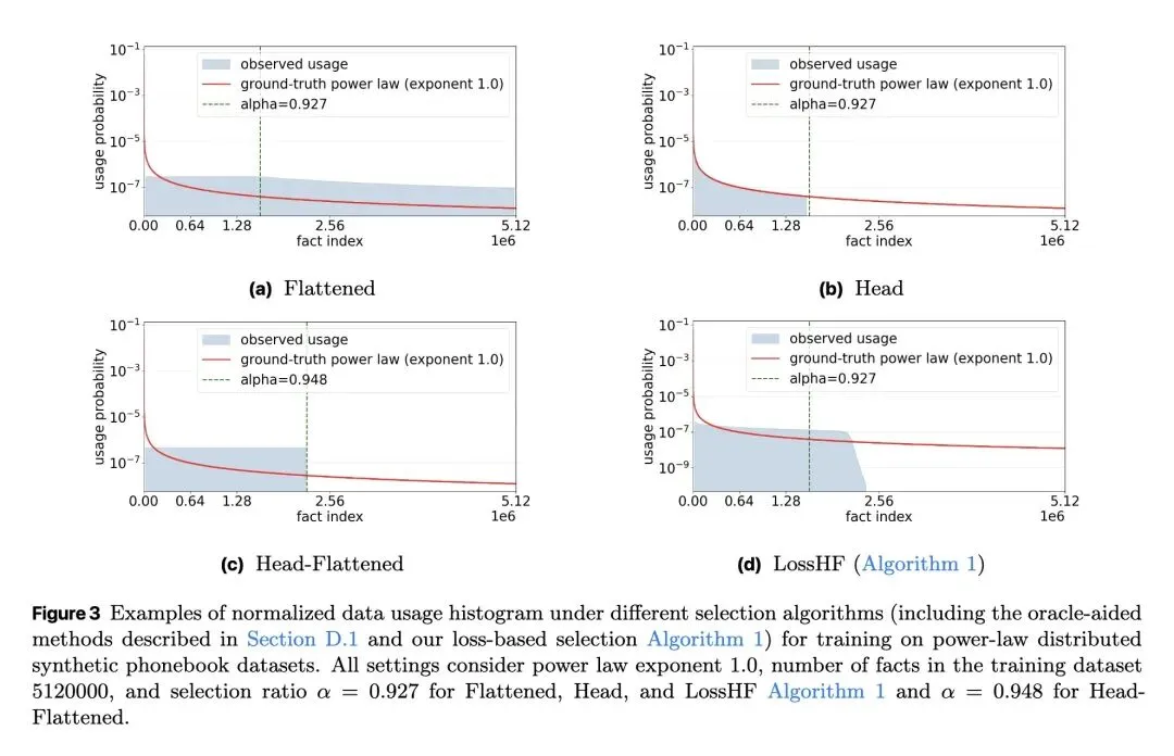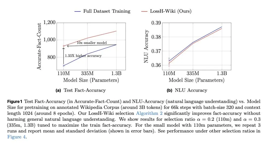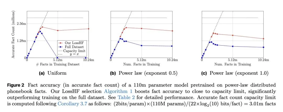 从信息论视角形式化了“事实记忆(Fact Memorization)”,在理论上证明了大型语言模型能够准确回答的独立事实数量存在容量极限(约等于2比特/参数)。 关于训练分布的反直觉发现: 当训练数据包含的事实数量超过模型容量时,盲目在全量数据上训练并不会让模型“部分记住”所有事实,反而会导致整体事实准确率出现断崖式下跌(陷入次优分配)。当事实呈现长尾(幂律)分布时,这种性能崩塌尤为严重。 反直觉的数据筛选策略: 当前主流的数据筛选算法(如Rho-1、Rho-Loss)通常优先选择高损失(High-loss)的样本(即困难或未学会的样本)。但本文提出相反的策略:优先选择低损失样本(LossH/LossHF)。因为高损失事实往往处于长尾且超出模型容量,而保留低损失事实才能确保训练数据与模型的记忆容量相匹配。 提出了LossH(保留头部/低损失事实)和LossHF(在保留头部事实的基础上,进一步压平/降采样重复度极高的极低损失事实)算法,使训练数据的规模与分布适配模型的参数量。 高信息熵结果: 在维基百科语料上从头预训练时,使用该修剪策略的1.1亿(110M)参数GPT-2小模型,其记忆的实体事实数量比标准训练提高了1.3倍,其事实准确率直接媲美在全量数据上训练的13亿(1.3B,即10倍体量)大模型。 强调数据修剪必须在“事实级别(Fact-level)”进行,而非“Token级别”。按Token进行修剪会破坏事实的语义边界,无法带来任何记忆性能的提升。