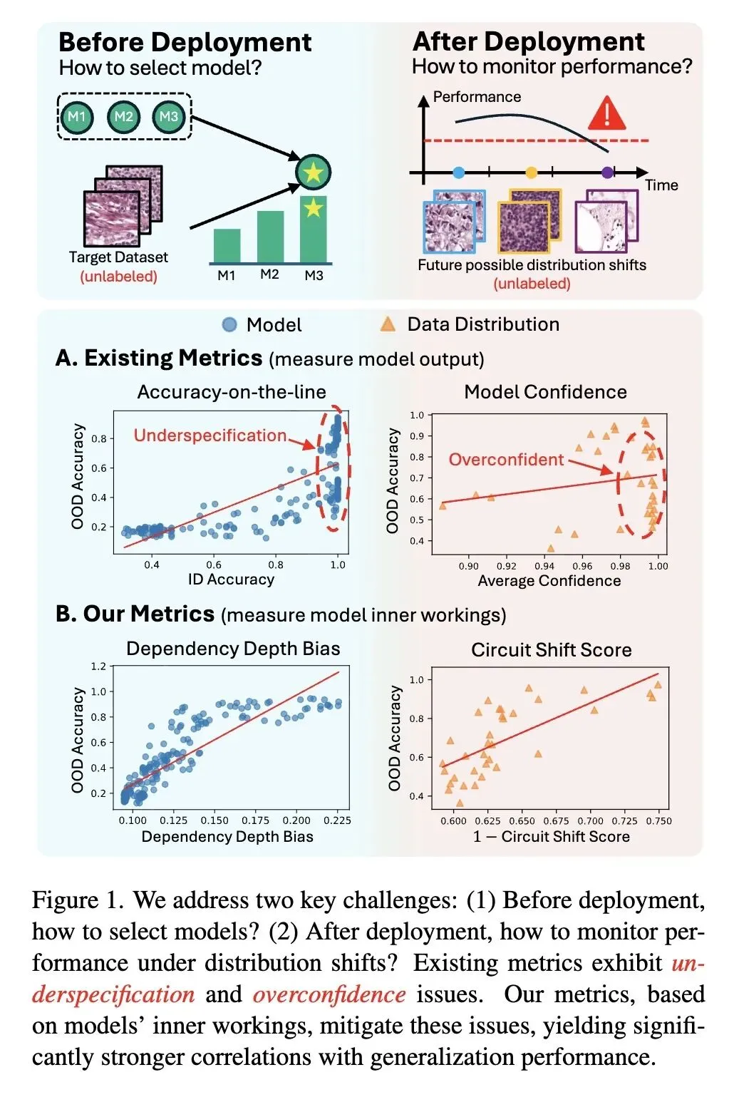 提出了一种基于模型内部机制评估泛化能力的新框架。 针对部署前场景,设计了DDB(依赖深度偏差)指标,有效度量不同模型在目标数据上的泛化潜力。 针对部署后场景,设计了CSS(回路偏移分数)指标,通过捕捉回路的动态重连,精准预测分布偏移带来的性能衰退。 在PACS、Camelyon17等多个多域基准数据集上进行了广泛实验,证明了基于回路的指标大幅超越了现有SOTA代理指标(如置信度、ATC、RANKME等)。