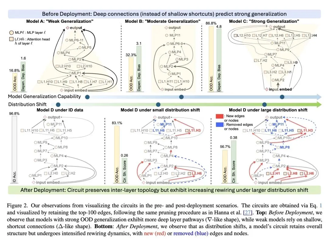 挑战了使用模型输出(如置信度、accuracy-on-the-line)作为分布外(OOD)泛化代理指标的传统范式,指出它们极易受到“规范不足(underspecification)”和“过度自信(overconfidence)”的影响。 反直觉观点: 即使完全没有目标领域的真实标签,仅仅通过分析模型的内部“布线”(因果机制/回路),也能稳健地预测模型的泛化能力。这要求我们将模型视为白盒而非黑盒。 将“回路(Circuit)”的定义从二值子图重新表述为连续的边权重映射,从而保留了对连续泛化评估至关重要的细粒度结构信息。 高信息熵发现(部署前): 使用典型相关分析(CCA)发现了一种“通用泛化模体(Universal Generalization Motif)”。该模体揭示:泛化能力强的模型严重依赖深层到深层的路径(促泛化),而泛化能力弱的模型则依赖浅层的捷径连接(反泛化)。 提出了依赖深度偏差(DDB)用于部署前的模型选择,该指标量化了模型对深层特征与浅层特征的相对依赖程度。 高信息熵发现(部署后): 观察到当单一模型面临数据分布偏移时,其宏观的层间拓扑结构保持稳定,但微观上的“重连(rewiring)”(即回路边权排名的变化)相对于域内(ID)基线会显著加剧。 提出了回路偏移分数(CSS)用于部署后的性能监控,衡量模型回路在向量或图空间中偏离其ID基线的程度。 引入了一种巧妙的CSS阈值校准策略,利用替代性的损坏数据集(如图像受损/风格化数据)来设定可靠的“静默失效”警报,而无需目标数据标签。 实验表明,DDB和CSS的预测相关性分别比现有的基于输出或特征的代理指标平均高出13.4%和34.1%,将模型失效检测的F1分数提升了约45%。
